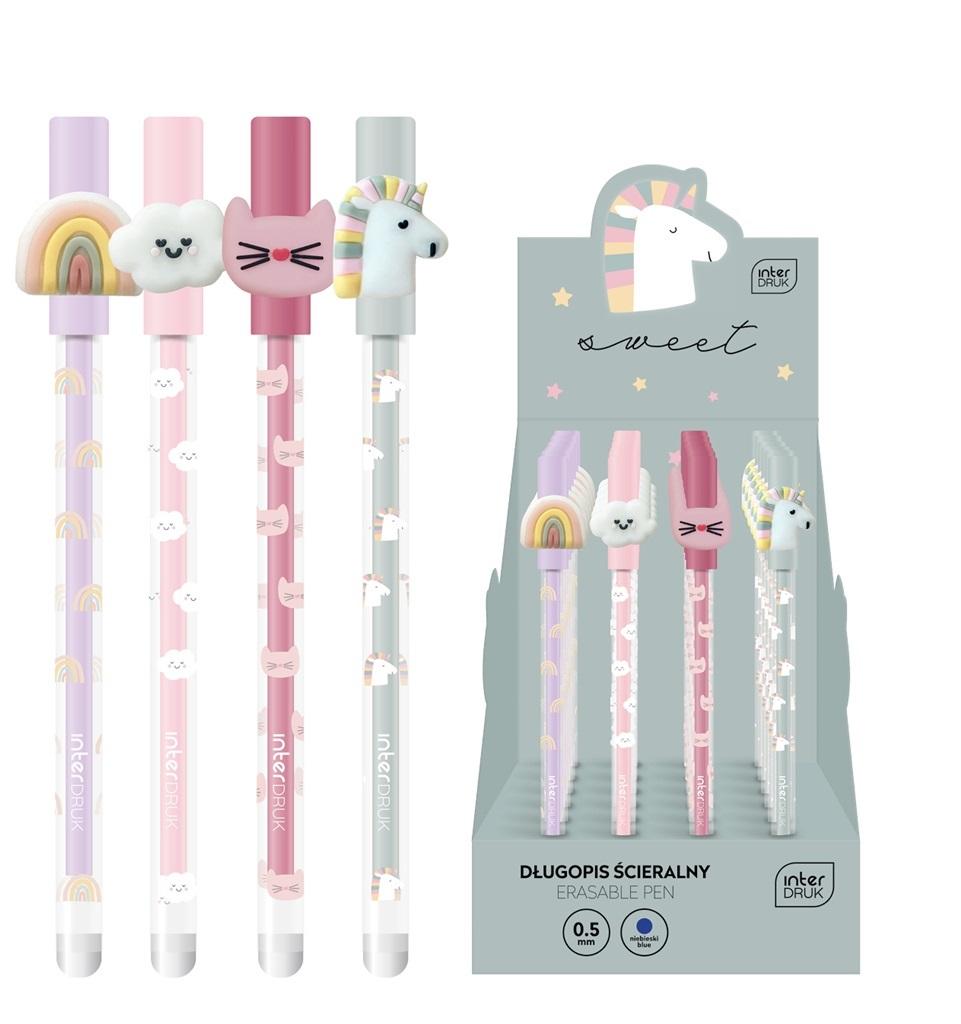 Długopis ścieralny zamykany na skuwkę z figurką. Grubość pisania: 0.5 mm. Niebieski wkład. Zakończony gumką, która umożliwia szybką i estetyczną korektę napisanego tekstu, bez użycia korektora czy przekreślania. 4 wzoru do wyboru. 24 szt. w displau.