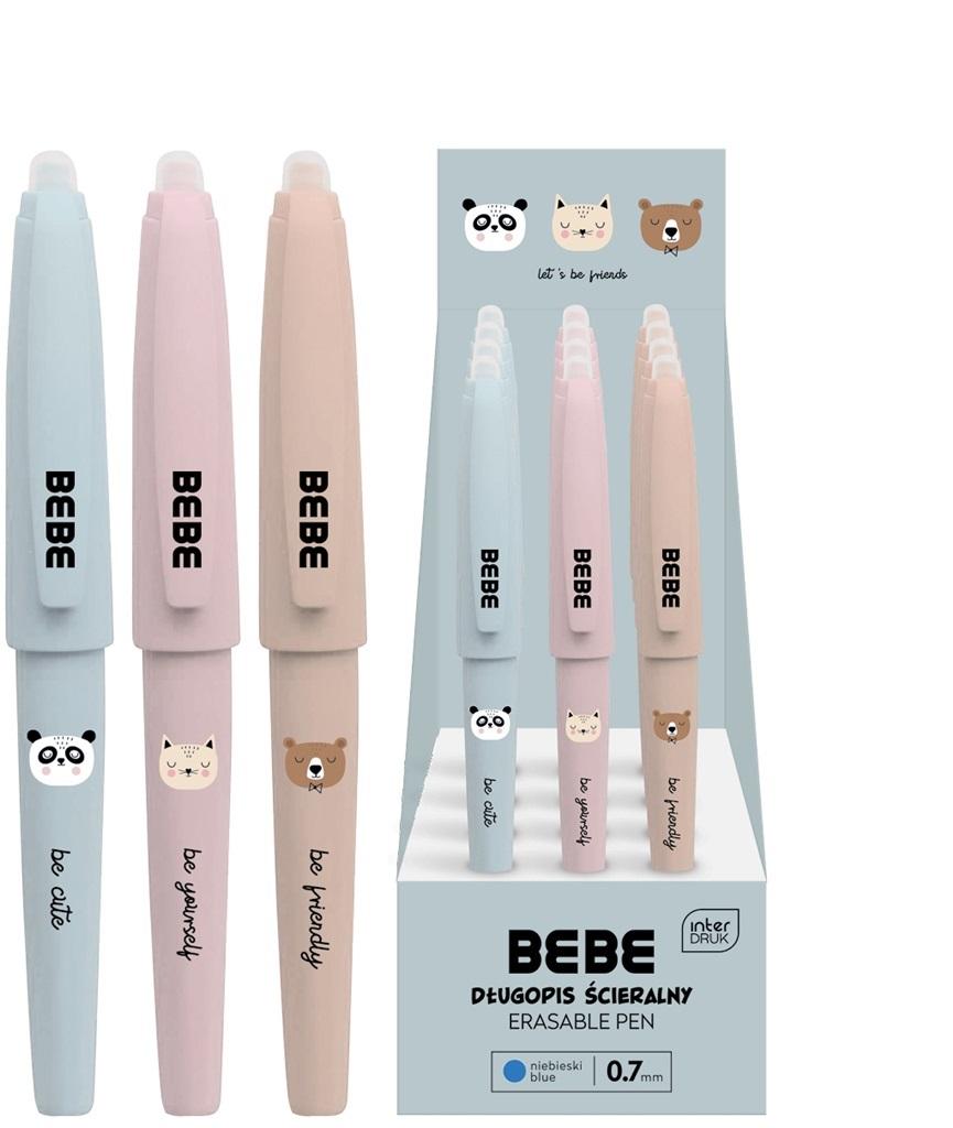 Długopis ścieralny ze skuwką. Gumowy, profilowany uchwyt ułatwiający prawidłowe trzymanie. Miłe w dotyku wykończenie soft touch. Ściera nie pozostawiając śladów. Wymienny, niebieski wkład. Grubość pisania: 0.7 mm. Nadruk zwierzaków z serii BEBE Friends. 3 wzory do wyboru. 12 sztuk w displayu.