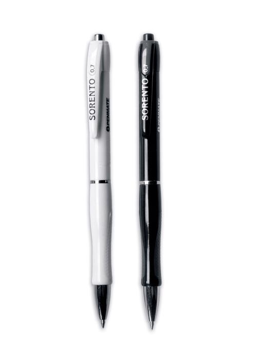Długopis automatyczny z wymiennym wkładem, atrament o niskiej zawartości wiskozy, końcówka kulkowa 0,7mm, gumowe wkładki w części chwytowej, obudowa w kolorze białym i czarnym. 24 sztuki w opakowaniu zbiorczym.