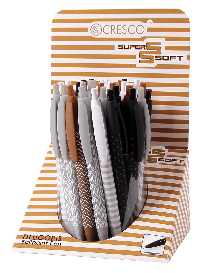 Długopisy z kolekcji SUPER SOFT to znakomita kolorystyka opierająca się o najnowsze trendy. Cały długopis posiada gumową SOFTOWĄ powłokę co jest dużym atutem tego produktu. Zapewnia pewne trzymanie w dłoni. Długopisy wyposażone w wkład piszący w kolorze niebieskim z formułą szybkopiszącą i cieńką końcówką. Występują w dwuch gamach kolorystycznych. Cztery kolory bardziej stonowane (eko) oraz cztery kolory pastelowe (pastel). W opaowaniu 36sztuk