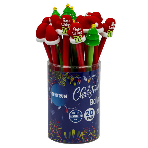Fantazyjny długopis zamykany na skuwkę zakończony figurką choinki i czapki. Tusz w kolorze niebieskim