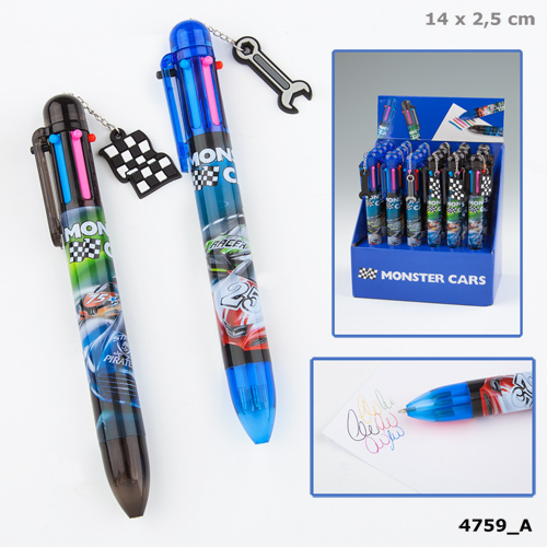 Długopis sześciokolorowy Monster Cars. Super długopis 6 w 1. Kolorowe wkłady: czarny, niebieski, różowy, czerwony, zielony i pomarańczowy. Dwa rodzaje zawieszek, klucz lub flaga. Super długopis dla wielbicieli samochodów!