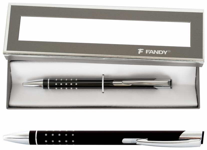 Metalowy długopis automatyczny, wymienny wkład F-Parker, uchwyt z gumowymi wypustkami dla wygodnego trzymania, niebieski kolor tuszu, grubość linii 0,7 mm, pudełko upominkowe.