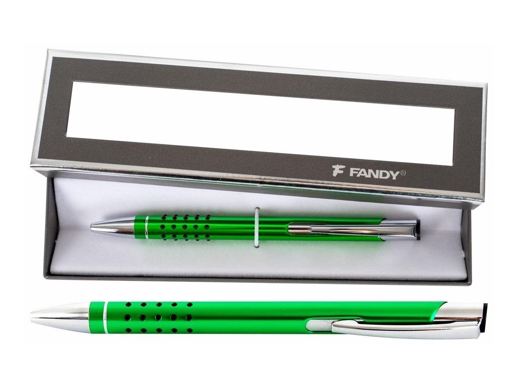 Metalowy długopis automatyczny, wymienny wkład F-Parker, uchwyt z gumowymi wypustkami dla wygodnego trzymania, niebieski kolor tuszu, grubość linii 0,7 mm, pudełko upominkowe.