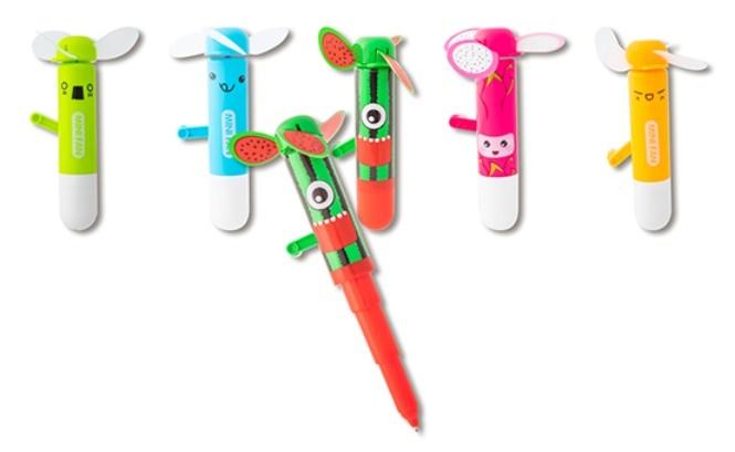 Kolorowe wiatraczki - długopisy. Jeśli jest ci za gorąco wystarczy, że pokręcisz korbką, a za chwilę poczujesz chłodny powiew powietrza. Jeśli natomiast potrzebujesz długopisu, wystarczy że otworzysz skuwkę i rozłożysz długopis. Długopis -wiatraczek występuje w kilku wersjach kolorystycznych: arbuz, liczi, pomarańczowej, limonkowej, niebieskiej i fioletowej. Pamiętaj, że ma znaczenie w którym kierunku kręcisz wiatraczkiem. Jeśli nie czujesz chłodnego powietrza, kręć korbką w drugim kierunku.