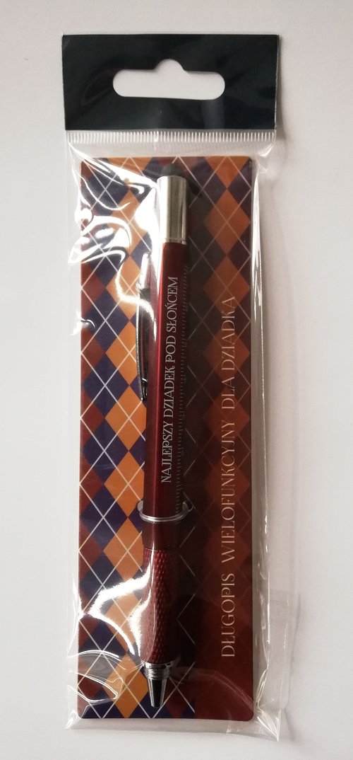 Długopis wielofunkcyjny ze specjalną dedykacją dla dziadka. Lekki, zawsze po ręką. Oprócz podstawowej funkcji pisania, posiada : miarkę ‘CM’ miarkę „cale’ poziomicę miękką końcówkę do ekranów dotykowych śrubokręt płaski śrubokręt krzyżykowy metalowy klips po jednej stronie, dzięki czemu można go przyczepić do kieszonki ubrania. Doskonały prezent dla majsterkowicza, jak również przydatny gadżet w domu i w samochodzie. Kolor: metaliczny granatowy Materiał: tworzywo sztuczne Wymiary : dł.15 cm