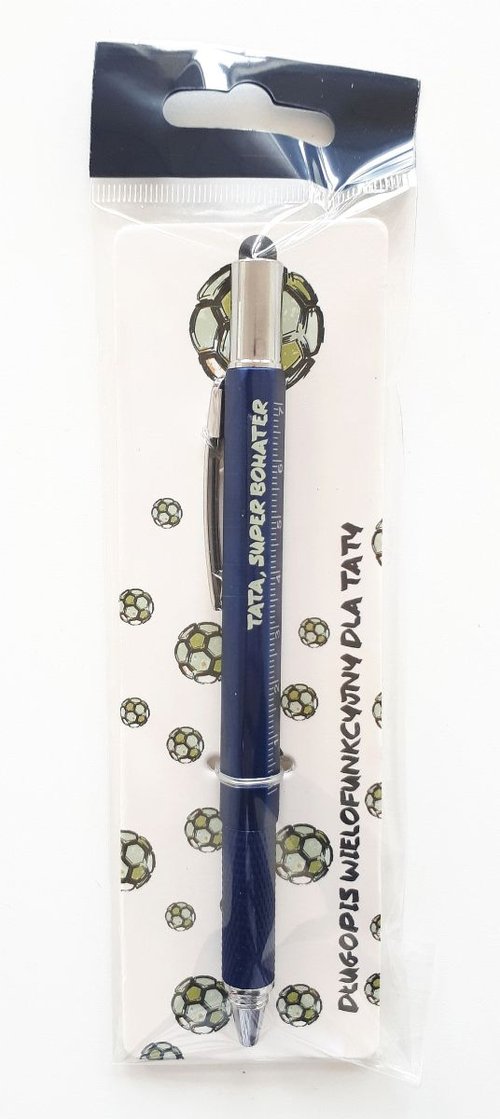 * wielofunkcyjny długopis z dedykacją „Tata, Super Bohater” * funkcje: - długopis - poziomica - linijka – cale - linijka – cm - śrubokręt krzyżakowy - końcówka otuch do ekranów dotykowych * doskonały pomysł na prezent dla Taty nie tylko z okazji jego święta