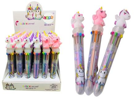 Długopis Wielokolorowy Jednorożec Automatyczny 10 Kolorów Mix Ten funkcjonalny długopis łączy w sobie zabawę i praktyczność, oferując aż 10 kolorów w jednym narzędziu do pisania. Długopis ozdobiony jest uroczo wyglądającym motywem jednorożca, który z pewnością przyciągnie uwagę dzieci i uczyni codzienne pisanie bardziej ekscytującym. Wyposażony jest w kilka kolorów atramentu, co pozwala na łatwe zmienianie kolorów bez potrzeby zmiany pisaka. Każdy kolor jest idealny do różnorodnych zastosowań, od rysowania po pisanie. Aby zmienić kolor, wystarczy nacisnąć na figurkę jednorożca, co sprawia, że zmiana koloru jest szybka i zabawna. To intuicyjne rozwiązanie ułatwia dzieciom wybór odpowiedniego koloru do każdej pracy. Ten długopis to doskonały sposób na wzbudzenie zainteresowania pisaniem i rysowaniem. Dzięki połączeniu kolorowego atramentu i interaktywnego motywu jednorożca, długopis staje się atrakcyjnym i praktycznym narzędziem do nauki i zabawy. Cena dotyczy jednego długopisu, w opakowaniu zbiorczym znajduje się 36 sztuk. Kolor wybierany losowo. Posiada certyfikat CE. Przeznaczony dla dzieci powyżej 3 roku życia.