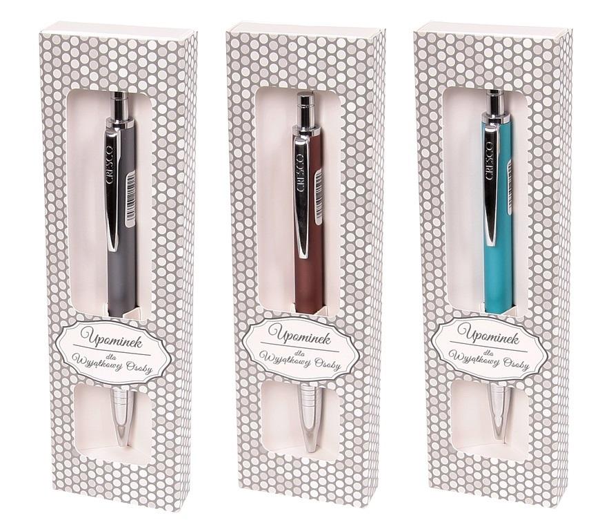 Miks kolorów, towar wysyłany losowo. Cena za sztukę. Elegancki długopis metalowy z kolekcji WINNER PASTEL to nowa propozycja CRESCO. Zapakowany w kartonowe etui prezentowe w sam raz na upominek na każdą okazję. Wkład wielko pojemnościowy typu PARKER koloru niebieskiego 1 mm. Szeroka gama pastelowych kolorów.