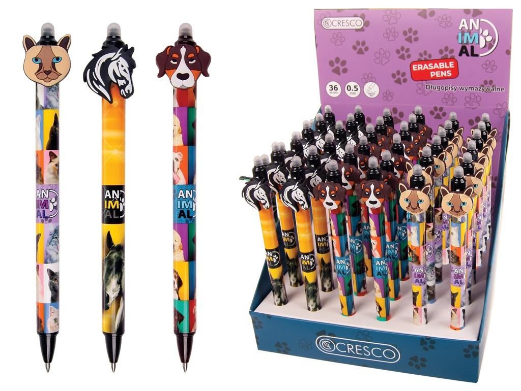 Długopis wymazywalny CRESCO o tematyce ANIMALS. Pstrykany system wysuwania niebieskiego wkładu o linii pisania 0,5mm. Opakowanie zawiera 36szt w mixie wzorów.