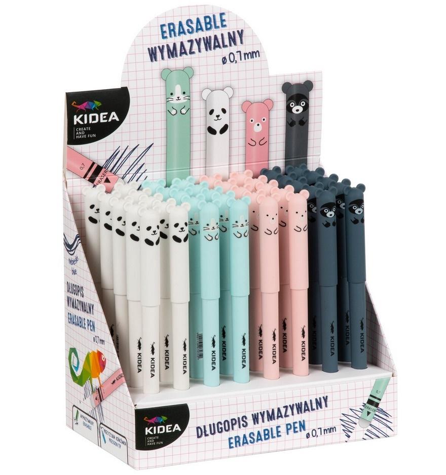 Wyróżnia go słodki zwięrzęcy motyw z uszkami. Długopis wymazywalny idealnie sprawdzi się w szkole, ponieważ gumką w końcówce, można wymazać każdy popełniony podczas pisania błąd. Precyzyjna końcówka i przyjemny w dotyku, satynowy korpus sprawiają, że pisanie nim to czysta przyjemność.