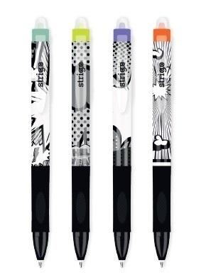 Wymazywalny, automatyczny długopis STRIGO z kolekcji Comic. Wyposażony w trójkątny, ergonomiczny uchwyt, który zapewnia komfort użytkowania i naukę chwytu. Zakończony gumką, która umożliwia estetyczną korektę napisanego tekstu. Wystarczy potrzeć napisany tekst i bez użycia korektora, możemy poprawić błędy. Średnica końcówki piszącej 0,5 mm. W display u 36 sztuk. Kolor wkładu: niebieski.