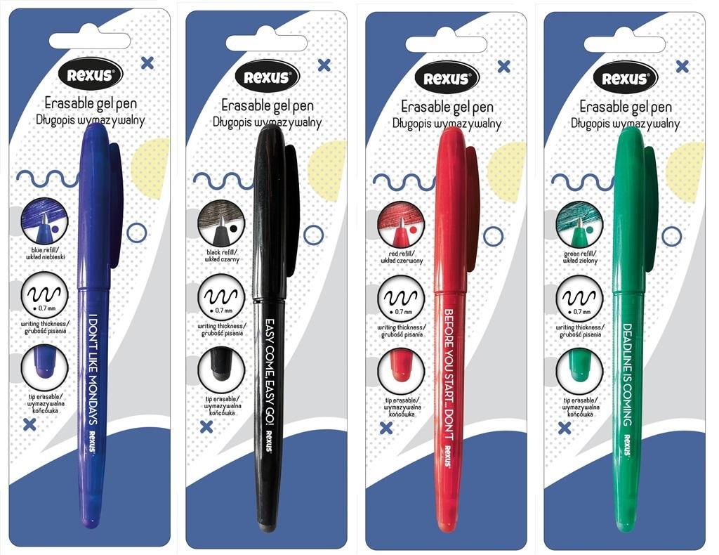 Długopis posiada wymazywany wkład. Końcówka długopisu pozwala wymazać błędy. Dostępny w 4 kolorach - każdy kolor odzwierciedla kolor wkładu długopisu. Grubość pisania 0,7 mm