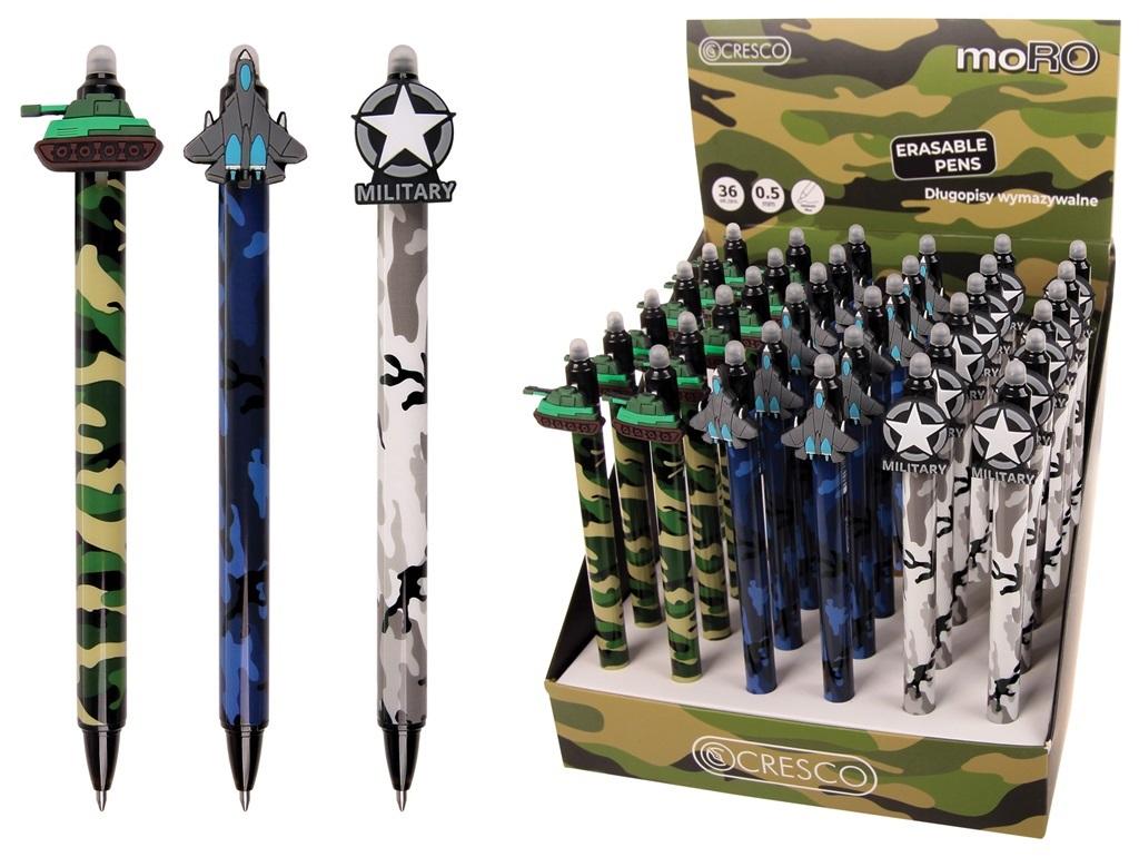Długopis wymazywalny CRESCO o tematyce MILITARNEJ. Pstrykany system wysuwania niebieskiego wkładu o linii pisania 0,5mm. Opakowanie zawiera 36szt w mixie wzorów.