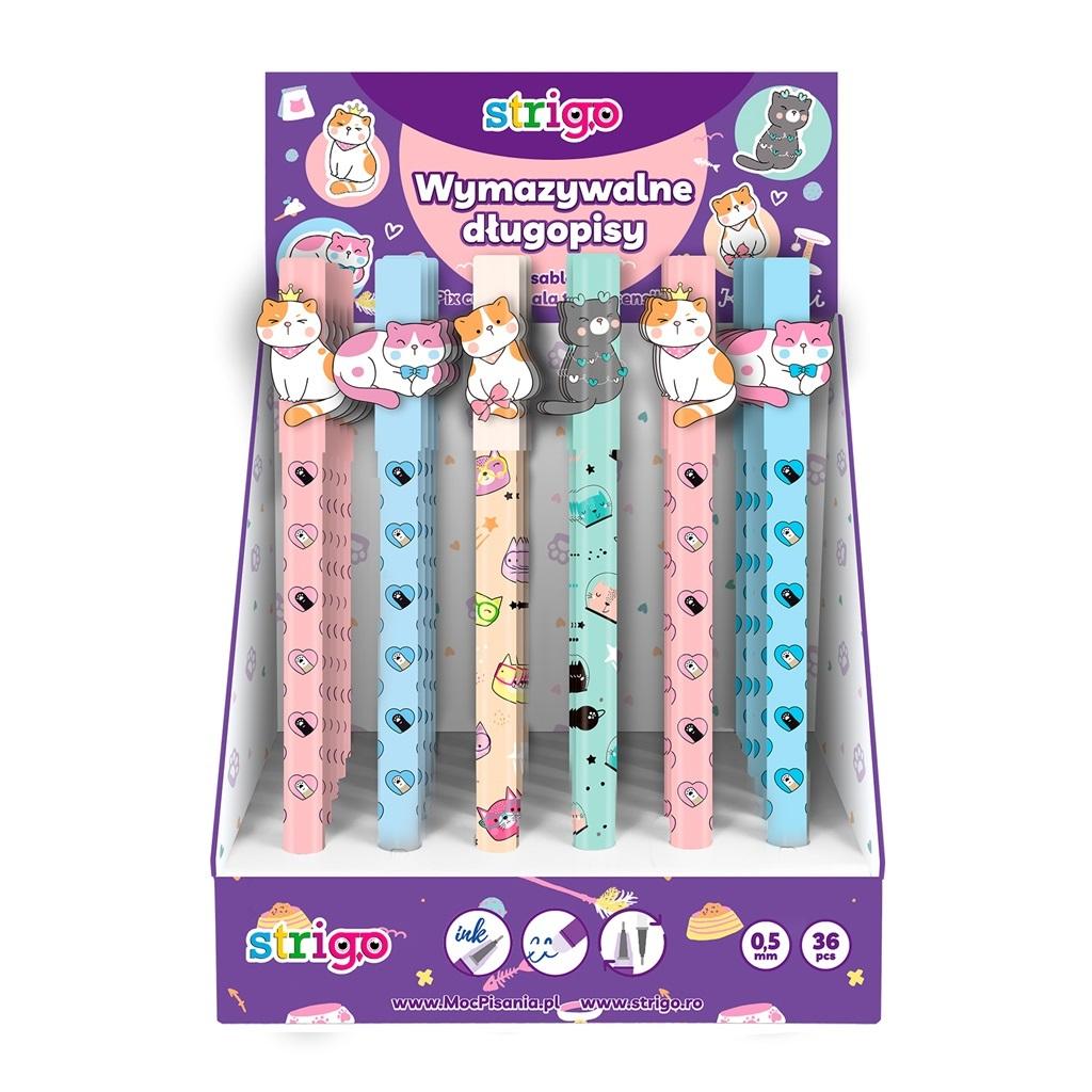 Wymazywalny długopis STRIGO ze skuwką z serii Kociaki. Średnica końcówki piszącej 0,5 mm. W display'u 36 sztuk po 9 sztuk ze wzoru.