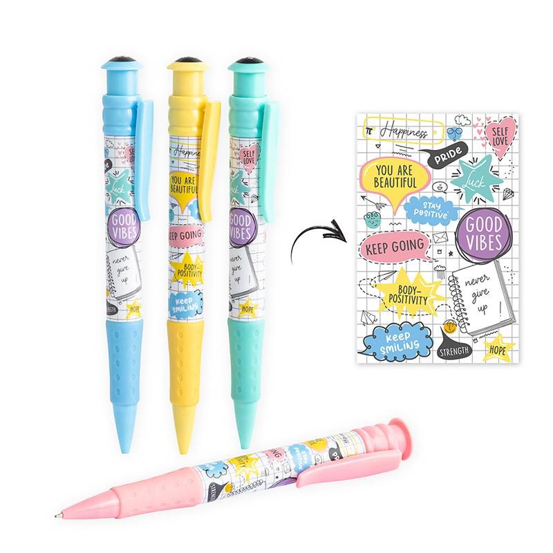 Dobre wibracje i zabawa są gwarantowane dzięki temu długopisowi motywacyjnemu w rozmiarze XL! Pozwól, aby stylowy design długopisu przyciągnął Cię motywującymi wiadomościami i sprawił, że Twoje codzienne życie stanie się odrobinę przyjemniejsze podczas pisania. Idealny pomysł na prezent dla wszystkich, którzy od czasu do czasu potrzebują zastrzyku motywacji lub po prostu potrzebują trochę dopingu podczas nauki i stresu egzaminacyjnego! Z wymiennym wkładem, czarny, szerokość linii 1,0 mm. Dostępny w 4 różnych kolorach: niebieskim, różowym, żółtym, zielonym. Wymiary artykułu wraz z opakowaniem: 2,3 cm x 2,3 cm x 18,7 cm x 2,3 cm