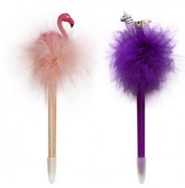 Długopis w kolorze różowym/fioletowym z miłym w dotyku, puchowym pomponem z lamą/flamingiem. Niezbędny element wyposażenia piórnika każdej młodej damy.