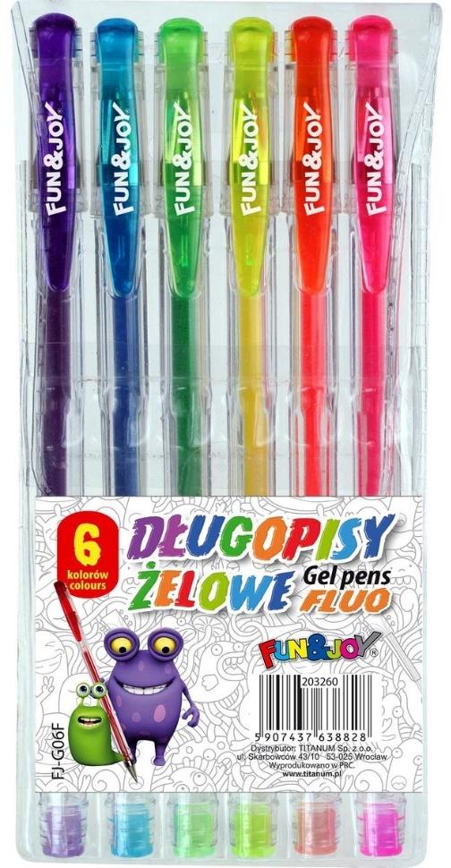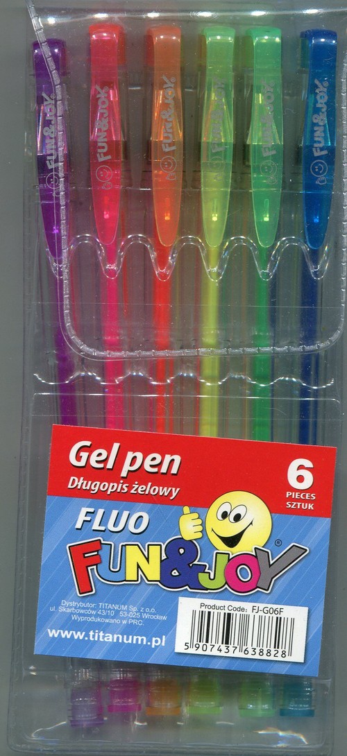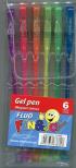 Długopis żelowy - w opakowaniu 6 kolorów: niebieski, zielony, żółty, pomarańczowy, różowy, fioletowy. Przezroczysta zatyczka z oznaczeniem koloru wkładu Grubość liniii pisania 0,7 mm