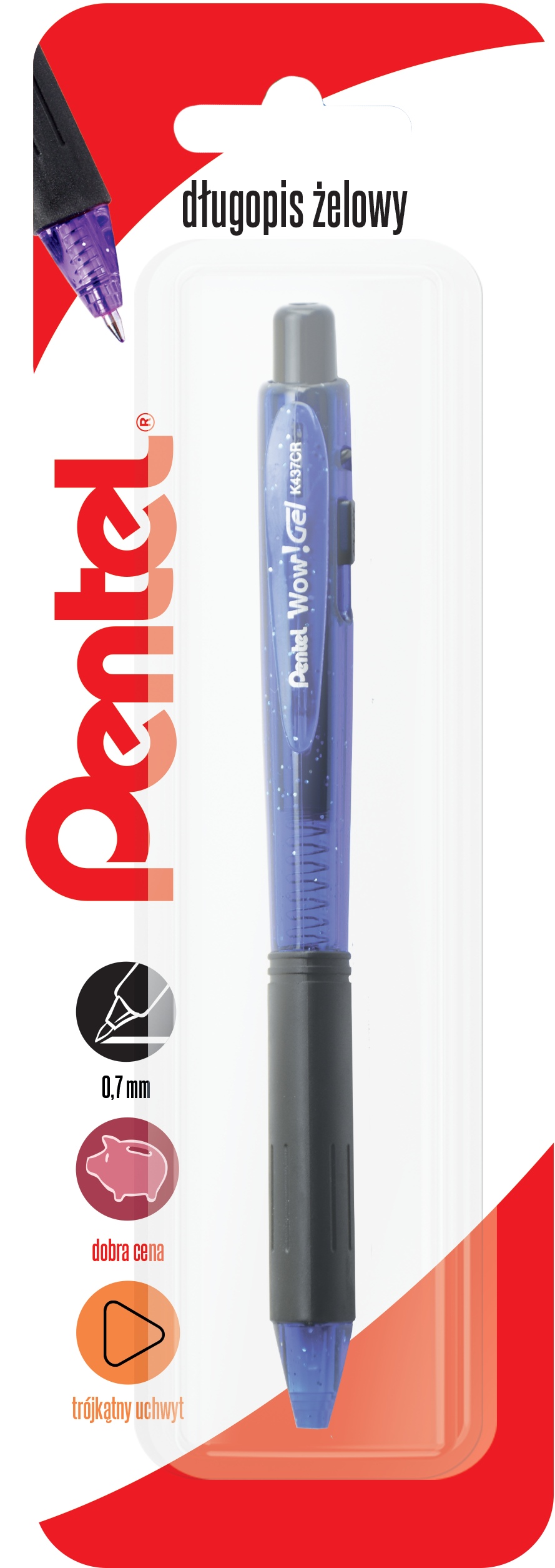 Długopis żelowy 0,7 mm, przebojowy długopis żelowy w brokatowej obudowie. Trójkątny gumowy wyrabia nawyk właściwego trzymania produktu. Niebieski kolor x 1 sztuka, blister.