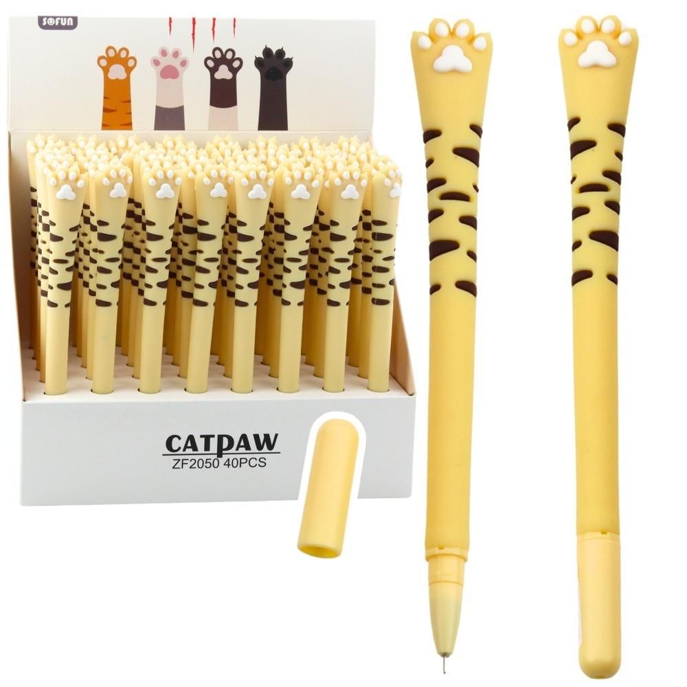 DŁUGOPIS ŻELOWY KOTEK ŻÓŁTY Długopis żelowy w żółtej wersji z brązowymi paskami to doskonałe połączenie wygody pisania i oryginalnego, zabawnego wyglądu. Jego elastyczna obudowa wykonana z miękkiej gumy gwarantuje komfort użytkowania, a przy tym stanowi ciekawy element dekoracyjny - szczególnie dzięki uroczej łapce w kształcie kociej łapki z wypustkami. Dzięki subtelnym prążkom w stylu tygrysim, długopis wyróżnia się na tle klasycznych akcesoriów biurowych. Wyposażony w niebieski tusz żelowy, zapewnia płynne i estetyczne pisanie, idealne zarówno w szkole, jak i w biurze. Długopis posiada zatyczkę, która zabezpiecza końcówkę i chroni tusz przed wysychaniem. Jego długość - 16,5 cm - sprawia, że z łatwością mieści się w piórniku lub torebce, co czyni go praktycznym gadżetem na co dzień. To idealny wybór dla dzieci, młodzieży, a także dorosłych, którzy cenią sobie wyjątkowe artykuły papiernicze z nutką humoru. W opakowaniu zbiorczym znajduje się 40szt. . SPECYFIKACJA: Długość długopisu: 16,5 cm Wymiary opakowania zbiorczego: 19,5 x 17 x 12cm Rodzaj: długopis żelowy z niebieskim tuszem Materiał obudowy: elastyczna guma w kolorze żółtym z brązowymi paskami ZAWARTOŚĆ ZESTAWU: 1x długopis żelowy żółty 1x zatyczka