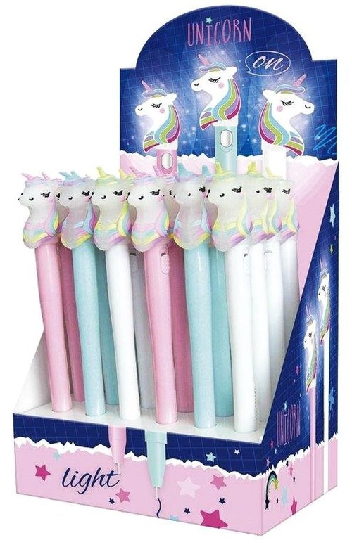 Długopis żelowy świecący z figurką Jednorożca. Ma okrągłą budowę, dzięki czemu idealnie układa się w dłoni. Zawiera wymienny wkład - kolor niebieski Wymagane użycie 3 baterii SR66 - baterie dołączone do zestawu. Opakowanie 24 sztuki