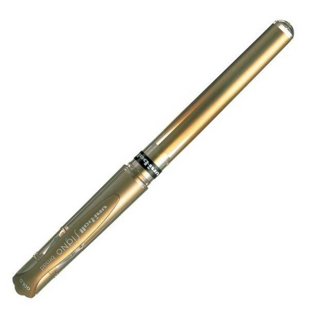 Długopis żelowy Uni-ball Um-153 Signo 1,0 mm, złoty. Idealny do dodania osobistego, dekoracyjnego akcentu do kartek z życzeniami lub zaproszeń. Wysokiej jakości żelowy tusz kulkowy.