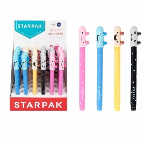 Żelowy długopis z zatyczką. Grubość pisania - 0,5 mm. Dostępny w różnych wzorach i kolorach - różowym, czarnym, żółtym i niebieskim.Przyjazne potworki na zatyczkach skutecznie umilą czas spędzony w szkolnej ławce.