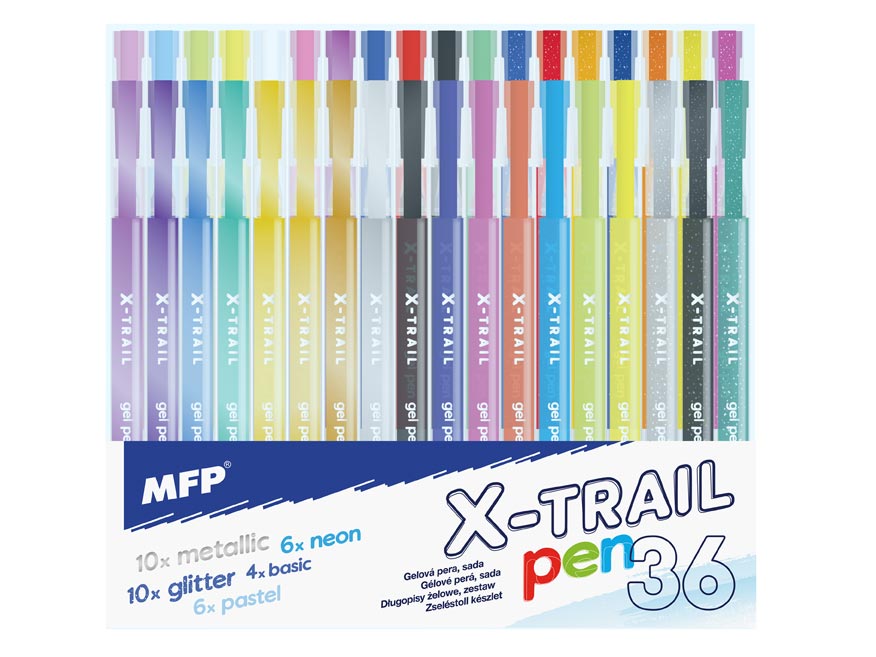 36 długopisów żelowych (10 x metalizowane, 10 x z brokatem, 6 x pastelowe, 6 x neonowe i 4 x kolorowe).