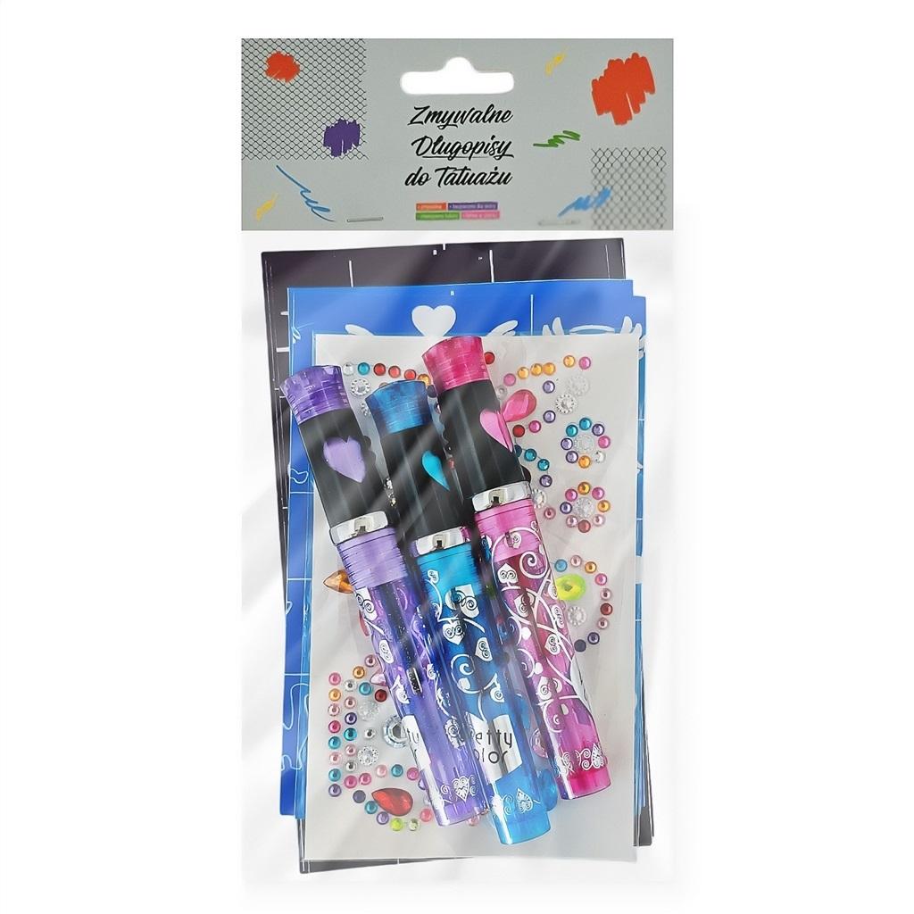 W zestawie: 3 kolory długopisów, 6 szablonów + tatuaże.