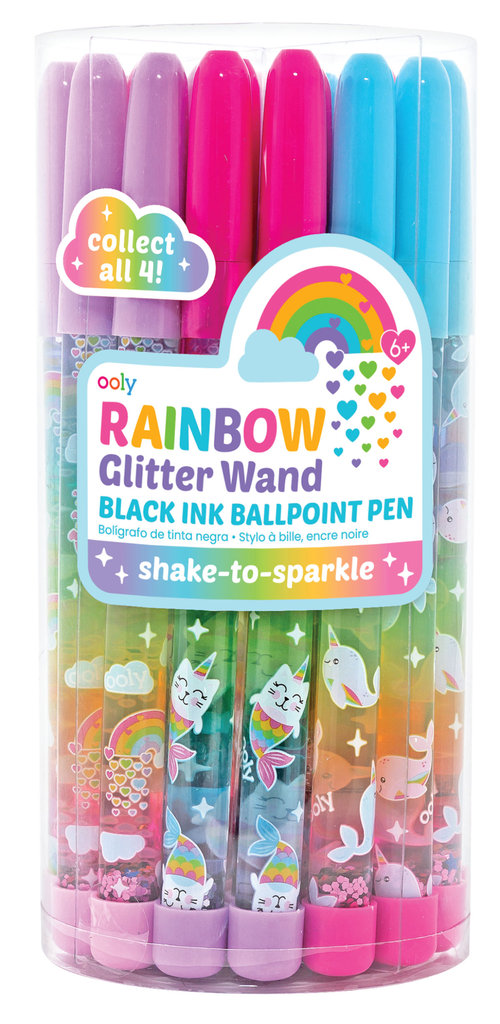 Tuba 24 szt. DŁUGOPISY TĘCZOWA BROKATOWA RÓŻDŻKA - 4 wzory - Potrząśnij i patrz jak lśni! - Czarny tusz - Rozmiar tuby: 9 x 19 cm