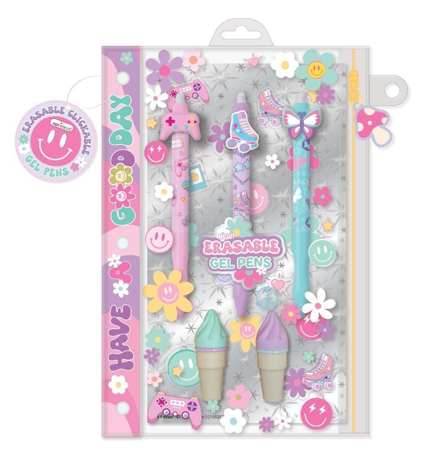 Zestaw zawiera: - 3 wymazywalne niebieskie długopisy żelowe - 2 zakreślacze w kształcie lodów - arkusz naklejek Zestaw zapakowany w przezroczystą saszetkę zapinaną na zamek. Wiek: 5+