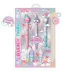 Zestaw zawiera: - 3 wymazywalne niebieskie długopisy żelowe - 2zakreślacze w kształcie lodów - arkusz naklejek Zestaw zapakowany w przezroczystą saszetkę zapinaną na zamek. Wiek: 5+