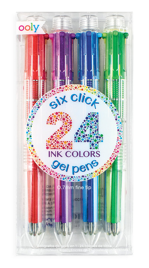 Zestaw 4 szt. DŁUGOPISY ŻELOWE 6-1 ZESTAW 24 KOLORÓW - 24 kolory, 6 w każdym długopisie - 20 zwykłych & 4 neonowe - Końcówka 0.7 mm - Tusze bezkwasowe