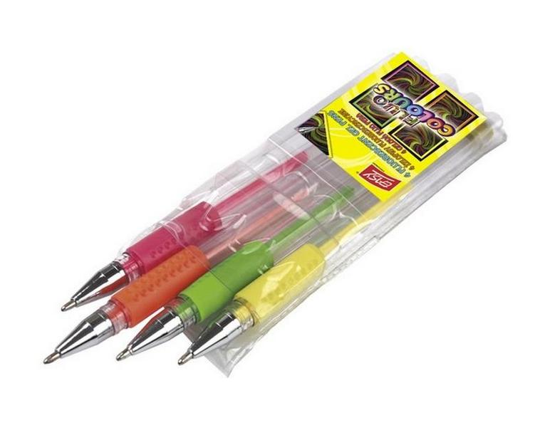 Długopis żelowy fluorescencyjny: -grubość wkładu: 1,0mm -ilość kolorów: 4 -wygodny, gumowany uchwyt -żywe, przyciągające kolory