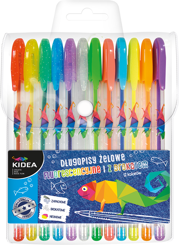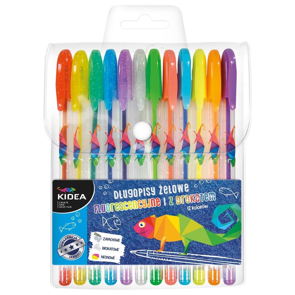 Opakowanie Długopisy żelowe Kidea fluorescencyjne i z brokatem 12 kolorów