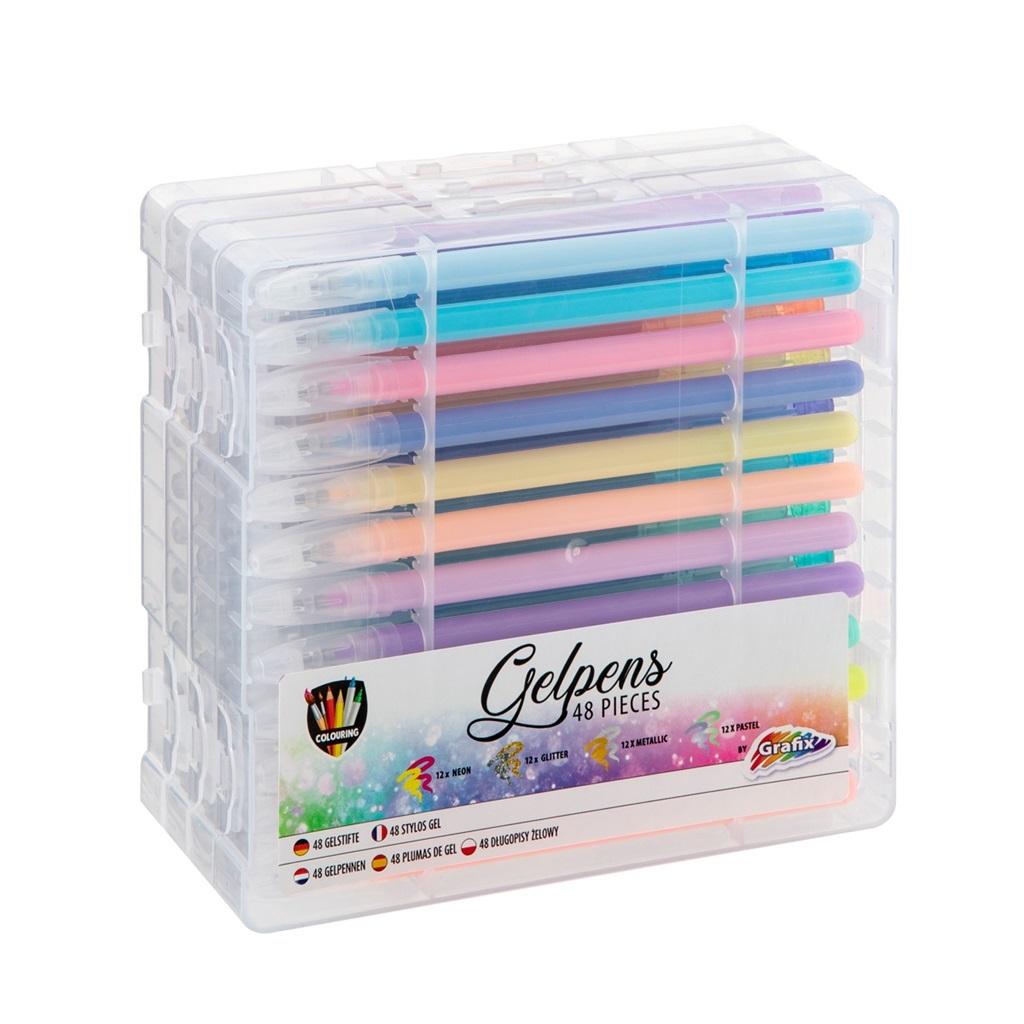 - W zestawie znajduje się 48x żelowych długopisów (12x pastelowe, 12x metaliczne, 12x neonowe i 12x brokatowe)