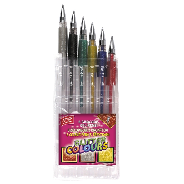 Długopis żelowy z brokatem: -grubość wkładu: 1,0mm -ilość kolorów: 6 -wygodny, gumowany uchwyt -żywe, przyciągające kolory