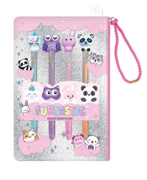 4 żelowe długopisy zapachowe z zabawnymi ozdobnymi końcówkami zapakowane w przezroczystą saszetkę zapinaną na zamek, dodatkowo sznureczek do wygodnego przenoszenia. Zestaw zawiera również klejące mini-karteczki w 4 różnych kształtach oraz arkusz naklejek. Wiek: 5+