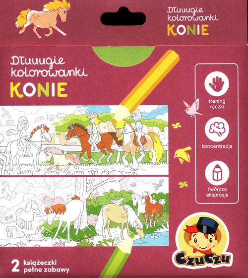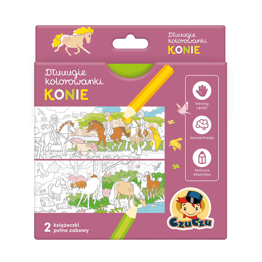 Zestaw zawiera 2 długie książeczki harmonijki pełne kreatywnych zabaw. To prawdziwa gratka dla wszystkich, którzy lubią konie i życie w siodle! Z jednej strony każdej książeczki znajduje się długa kolorowanka, a z drugiej twórcze zadania, dostosowanych do wieku przedszkolaków. Kolorowanki i łamigłówki inspirują do wesołych i rozwijających zabaw.