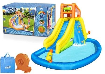 Dmuchana Zjeżdżalnia Wodna 435 x 286 x 267 cm Bestway 53345 Nadmuchiwany park wodny to wypełniona zabawą nadmuchiwana przestrzeń do wspinania się, zjeżdżania i odkrywania. Ściany wspinaczkowej Twoje dziecko będzie mogło wykorzystać aby dostać się do wieży z zamkniętymi ścianami z siatki. Duża zakrzywiona zjeżdżalnia, dzięki dozownikowi wody jest śliska co ułatwia zjazd i dodaje dodatkowej frajdy Rodzice i dzieci pokochają duży basen do ochłody. Wbudowanym spryskiwaczem można wycelować i namoczyć znajomych. Dmuchany plac zabaw może pomieścić jednocześnie do pięciu graczy. Jest wykonany z podwójnie szytego materiału, który zwiększa rozciągliwość, wytrzymałość i trwałość. Materiał zapewnia odporność na zużycie i warunki atmosferyczne. Można szybko spuścić za pomocą łatwo dostępnego wbudowanego zaworu spustowego. Ten nadmuchiwany park wodny jest wyposażony we własną torbę do przechowywania, dzięki czemu całą zabawę można łatwo spakować na kolejny dzień. W skład zestawu wchodzi: - Dmuchana zjeżdżalnia - Torba do przechowywania - Dmuchawa - 1 wąż do spryskiwania, - 1 worek kotwiczący, - 10 kotw do parku, -1 zestaw węża natryskowego Dane techniczne: - Wymiary 435 x 286 x 267 cm - Materiał PVC - Maksymalne obciążenie 270 kg - Czas nadmuchania to około 2 minuty - Wbudowana fontanna wodna Waga: 25 kg Wymiary opakowania: 45 cm x 45 cm x 73 cm
