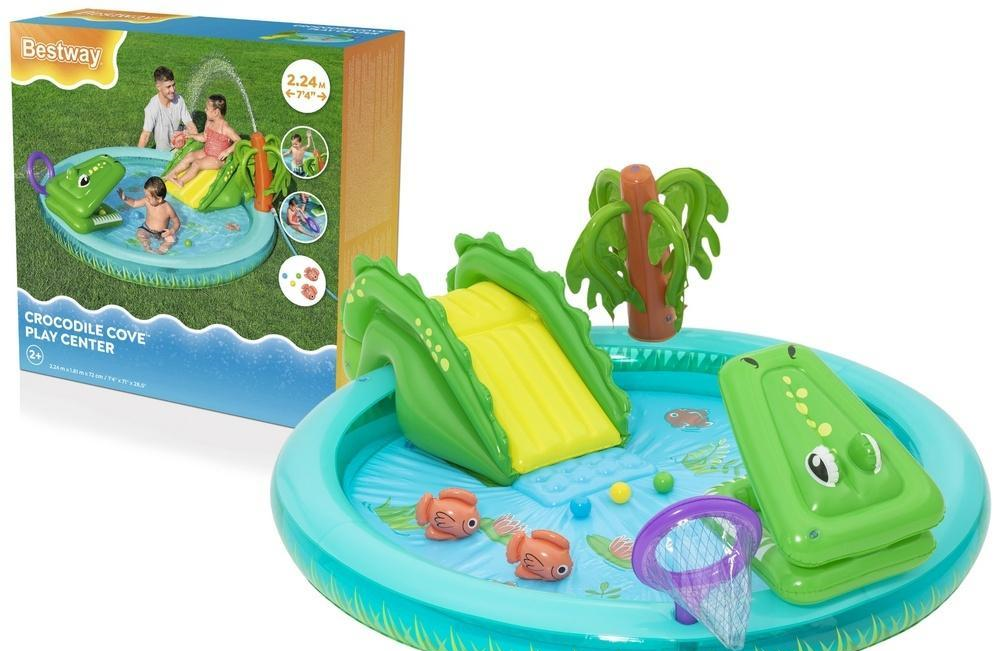 Dmuchany Plac Zabaw Krokodyl 224 x 181 x 72 cm Bestway 53166 Dmuchany plac zabaw Bestway "Krokodyl" to idealny sposób na zapewnienie dzieciom aktywnej i radosnej zabawy w ciepłe, letnie dni. Ten kolorowy zestaw łączy w sobie elementy wodnej zabawy, ruchu i kreatywności, tworząc bezpieczną przestrzeń do spędzania czasu na świeżym powietrzu.Kompaktowy rozmiar umożliwia łatwe przechowywanie, a szybka instalacja pozwala rozpocząć zabawę niemal od razu. Główne cechy produktu: Pojemność wody: 210 litrów Zalecany wiek: od 2 lat Wymiary: 224 x 181 x 72 cm Materiał: wytrzymałe PVC Zaokrąglone krawędzie dla większego bezpieczeństwa Zjeżdżalnia z miękkim lądowiskiem Zraszacz w kształcie palmy - łatwe podłączenie do węża ogrodowego Zdejmowana sieć rybacka Gra z krokodylem - dzieci mogą rzucać piłkami w paszczę, co wspiera rozwój koordynacji i celności Zestaw zawiera: 1 x dmuchany plac zabaw 1 x sieć rybacka 2 x rybki Puffy Pal 3 x piłeczki 1 x łatka naprawcza Waga opakowania: 2 kg Wymiary opakowania: 39 cm x 39 cm x 11 cm