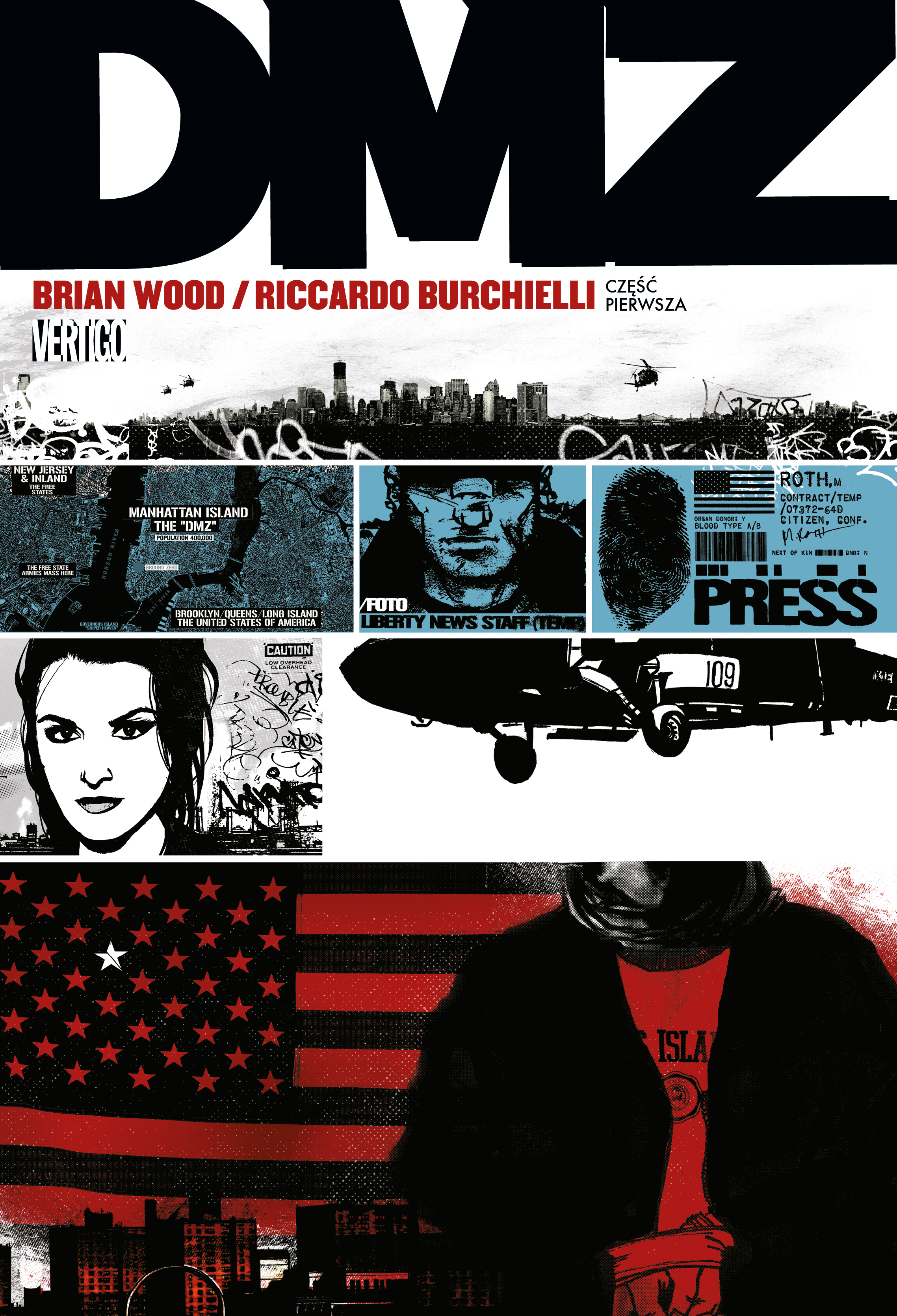 Pierwszy tom jednej z najciekawszych serii wojennych ostatnich lat. Akcja opowieści dzieje się w niedalekiej przyszłości. Stany Zjednoczone zwalczają antyestablishmentowe powstanie amerykańskich klas średnich, które utworzyły tak zwane Wolne Stany. Ta druga wojna secesyjna spustoszyła cały kraj, ale największym zniszczeniom uległ Nowy Jork. Rząd USA kontroluje wschód, Wolne Stany zachód, a obie strony starają się przejąć wyspę Manhattan, zwaną teraz strefą zdemilitaryzowaną – DMZ. Właśnie tam wylądował młody fotoreporter Matty Roth. Reszta jego ekipy prawdopodobnie zginęła – Matty jest sam, brakuje mu doświadczenia i sprzętu. Jednak w DMZ dostanie życiową szansę, by relacjonować wydarzenia, do których nie mają dostępu inni dziennikarze. Jeśli uda mu się pokazać prawdę, może zostać największym korespondentem wojennym w dziejach. Autorem scenariusza „DMZ” jest wielokrotnie nominowany do Nagrody Eisnera Brian Wood, znany z takich serii jak „Ludzie Północy”, „The Couriers”, „The Massive”, „Star Wars”, „Conan The Barbarian”, „Lord of the Rings” i „X-Men”. Rysunki wykonał włoski artysta Riccardo Burchielli, znany polskim fanom z serii „Ludzie Północy”.
