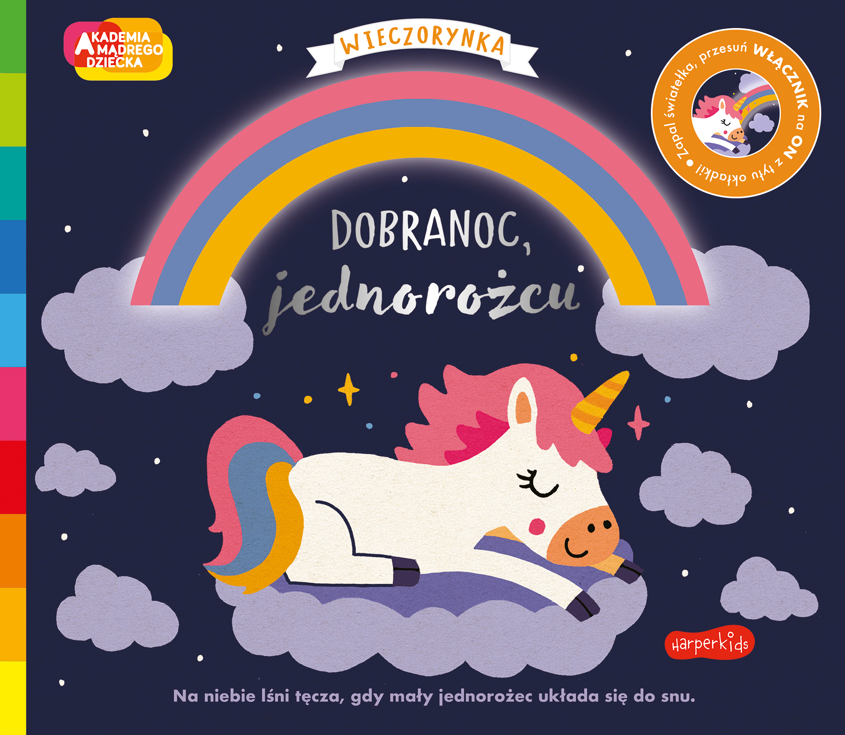 Książeczka ze światełkami Dobranoc jednorożcu z serii Wieczorynka, opowiada o małym jednorożcu, który nie może zasnąć, ponieważ zgubił swoją ulubioną przytulankę. Odwiedza po kolei swoich przyjaciół by sprawdzić czy któryś z nich nie ma przypadkiem pluszaka. Kolorowa tęcza oświetla mu drogę do innych zwierzątek: narwala, lamy, flaminga, dinozaura i sówek. W końcu znajduje swojego misia i zasypia wtulony w mamusię.