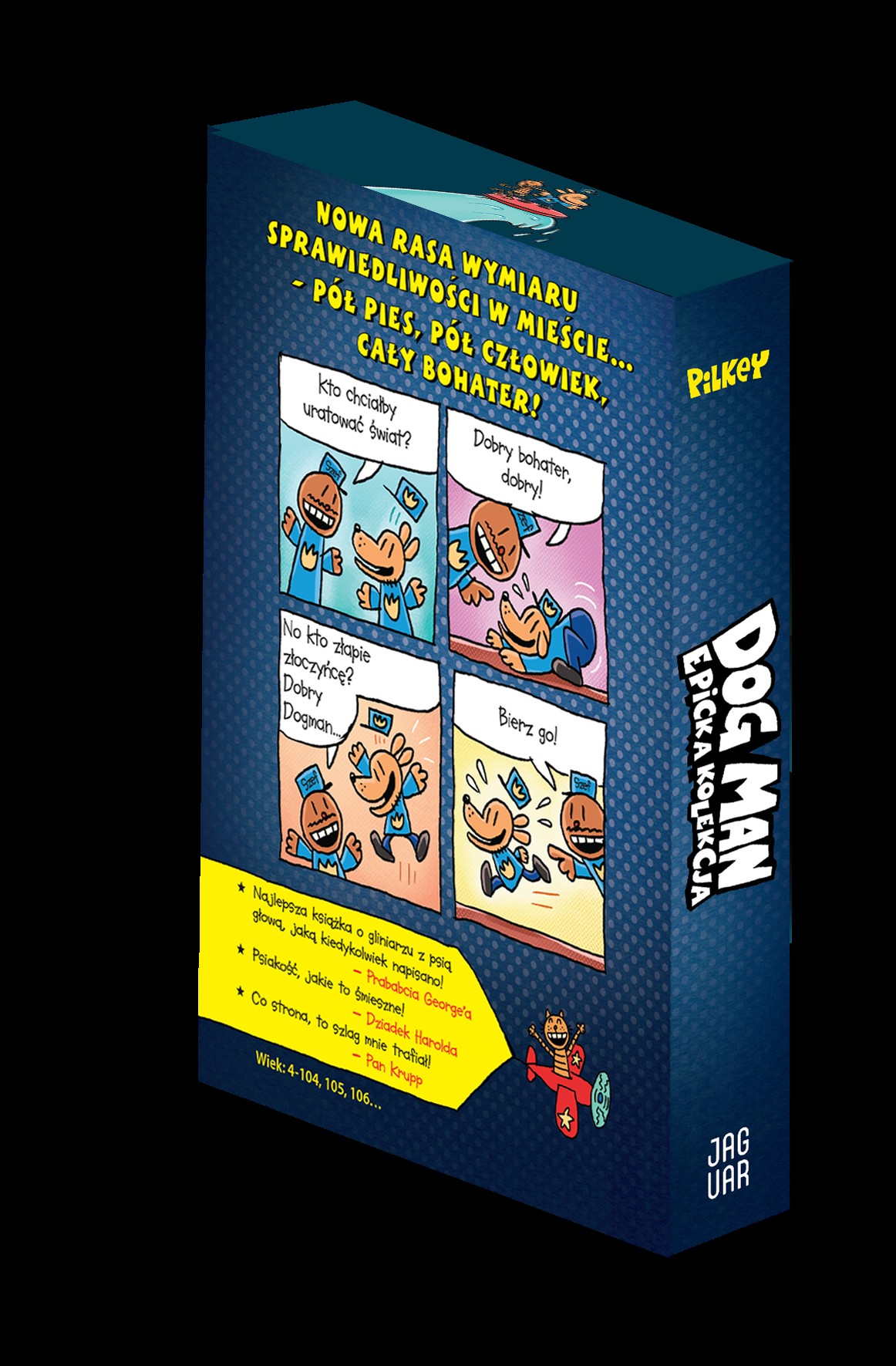 Uwielbiana seria o psim bohaterze, od twórcy Kapitana Majtasa, teraz w pakiecie! W bebechy zbrodni wgryza się glina idealny: pół pies, pół człek i CAŁY BOHATER! George i Harold wykreowali nowego herosa, który wygrzebuje spod ziemi ścierwo korupcji, chwyta za portki zmykających złoczyńców, rabusiom pokazuje kły wymiaru sprawiedliwości. Gdy policyjny pies Buras i aspirant Nać ulegli wypadkowi podczas pełnienia służby, epokowy zabieg chirurgiczny zmienił bieg dziejów: tak oto narodził się Dogman. Ten niestrudzony tropiciel występku ma prawdziwego nosa do trudnych śledztw! Tylko czy jego psi instynkt zdoła podkulić ogon wobec powołania, jakim jest służba prawu? Ten psiantastyczny pakiet zawiera trzy pierwsze tomy komiksu o Dogmanie: Dogman,Dogman. Bierz Go! oraz Dogman. Opowieść o dwóch kotach. Dogman to #1 na listach bestsellerów New York Timesa wśród książek dla dzieci. Przemawia do czytelników w każdym wieku i porusza uniwersalne, pozytywne tematy — takie jak empatia, życzliwość, wytrwałość oraz znaczenie pozostawania wiernym samemu sobie. Doskonała pozycja na pierwsze samodzielne czytanie!