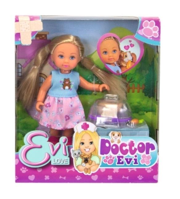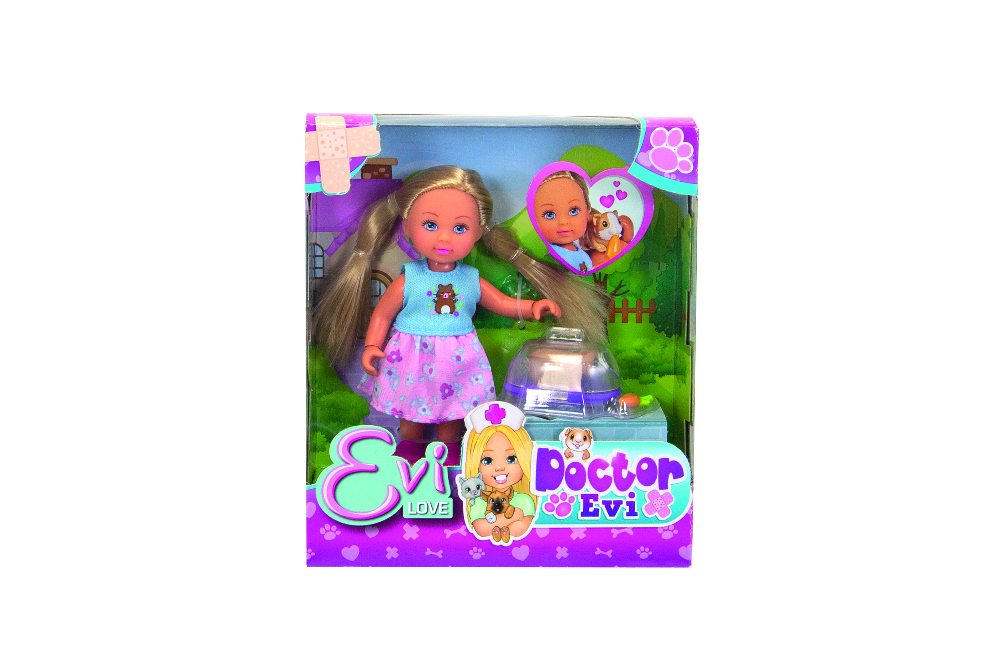 Laleczka Evi opiekuje się świnką morską. Evi nie musi rozstawać się z podopieczną - może zabierać ją ze sobą w kontenerku przeznaczonym do przenoszenia zwierzaczka. Kontenerek ma zdejmowaną pokrywę, laleczka ma zginane w kolanach nóżki i ruchome w nadgarstkach rączki, dołączone akcesoria można precyzyjnie mocować w rączkach laleczki za pomocą wypustek. Wysokość lalki: 12 cm, 3l+