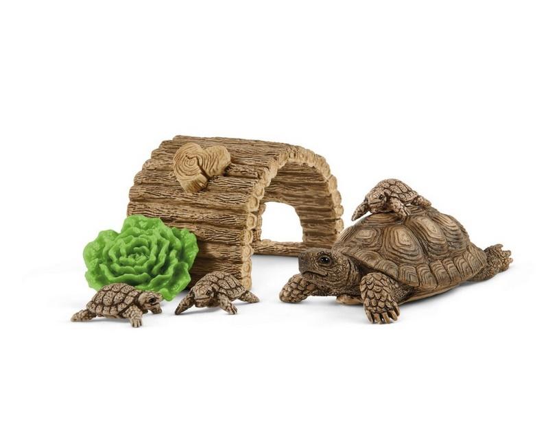 Domek dla żółwi z serii Schleich(R) Wild Life to praktyczne schronienie dla żółwi, chroniące gady przed słońcem, deszczem, wiatrem i zimnem. Tam żółwie mogą odpocząć, na przykład po małej wędrówce po ogrodzie, i najeść się świeżej sałaty. Jeśli dobrze się o nie dba, te fascynujące zwierzęta domowe mogą osiągnąć wysoki wiek. Niektóre gatunki dożywają nawet 70 lat.