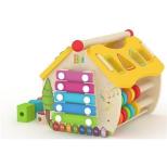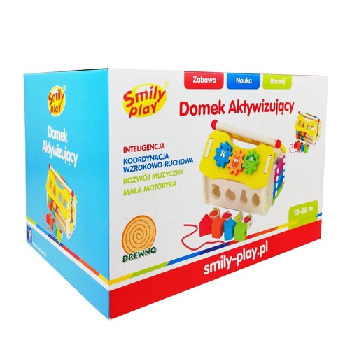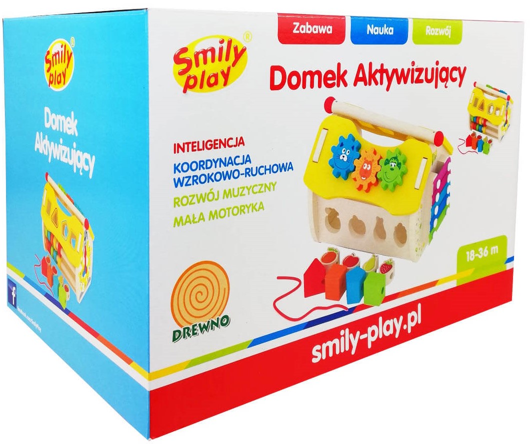 Domek Aktywizujący to drewniana zabawka, która doskonali sprawność rączek, koordynację wzrokowo-ruchową i wyobraźnię przestrzenną. Na każdej ścianie domku dziecko znajdzie inną zabawę: elementy do przesuwania, obrotowe zębatki, sorter, cymbałki, zegar z ruchomymi wskazówkami i zębate koła. Dodatkową atrakcją zabawki są klocki do nawlekania. Zabawka rozwija: inteligencję, kreatywność, zdolności manualne, wyostrza zmysł koncentracji. Wiek: od 18 do 36 m