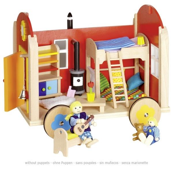 Domek dla lalek na kółkach jest jak wóz mieszkalny z romantycznych czasów taborów cygańskich. Jego mieszkańcy mają w środku do dyspozycji piętrowe łóżko z kolorową, patchworkową pościelą, regał, stolik i ławę. Nawet w chłodne dni będą się czuć komfortowo, dzięki piecykowi pośrodku domku. U drzwi jest dzwoneczek oznajmujący przybycie nowej lalki do zabawy. Domek tylko czeka na swojego dużego właściciela, który zawiezie mieszkańców w nowe miejsce przygód.