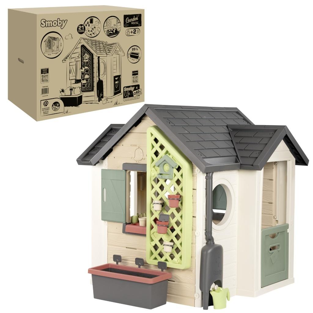 Domek ogrodnika, a w nim: blat, tablica z planem zasiewów, narzędzia ogrodnicze i doniczki, w których można zasadzić prawdziwe kwiaty lub warzywa. Rynna z konewką pozwala zbierać deszczówkę do podlewania roślin. Kratka na ścianie do zawieszenia doniczek oraz zdejmowany blat do sadzenia roślin. 64% plastiku użytego do produkcji domku pochodzi z recyklingu. Powłoka ANTI-UV chroniąca przed blaknięciem kolorów na słońcu. Wysokość: 135 cm. Wymiary: 128,5x132x135 cm. Wyprodukowany we Francji, 2 l+