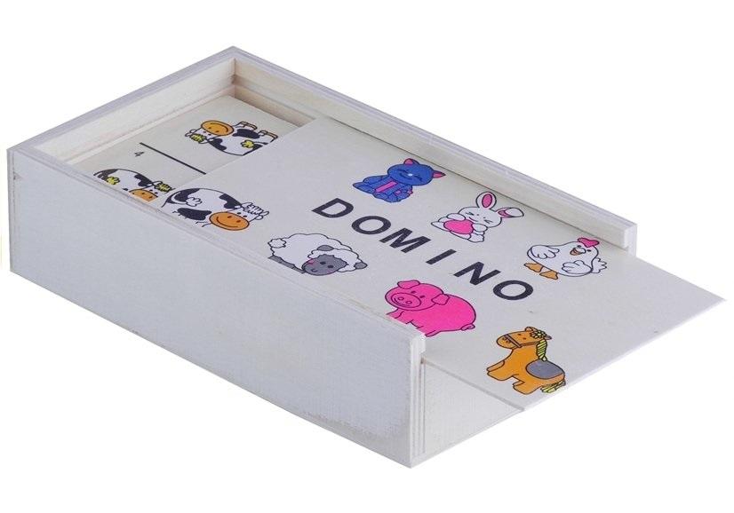 Drewniana gra domino ze zwierzątkami Domino to gra, którą znają niemal wszyscy. Prezentujemy fantastyczną wersję ze zwierzakami - zaprojektowaną specjalnie dla dzieci. Jak w klasycznym wariancie gry, używa się w niej płytek z nadrukami zwierzaków. Każda z nich podzielona jest na dwa kwadratowe pola z kolorowymi zwierzakami i liczbą od 0 do 6. Zestaw składa się z: - 28 podwójnych kostek, - drewnianego pudełeczka. Prezentowana gra domino przeznaczona jest dla maksymalnie czterech graczy. Jej zasady są bardzo proste: należy odwrócić klocki rysunkami zwierząt do spodu i wymieszać. Kolejnym krokiem jest wybranie malucha, który rozpocznie rozgrywkę - możecie wybrać go, biorąc pod uwagę wiek lub alfabetyczną kolejność imion. W tym momencie rozpoczyna się prawdziwa zabawa. Wszystkie dzieci biorące udział w zabawie wybierają kostki - po jednym kamieniu lub od razu w odpowiedniej liczbie - przy czterech graczach maksymalnie po 7 sztuk. Należy uprzedzić maluchy, by nie pokazywały swoich kostek pozostałym graczom. Kamienie, które zostaną na stole, są tak zwanym talonem. Wylosowany wcześniej zawodnik wykłada dowolny ze swoich kamieni, a pozostali dokładają swoje kostki według ustalonych zasad: powinny się stykać identycznym obrazkiem. Jeśli któryś z graczy nie posiada kamienia, który mógłby dołożyć według tego schematu, dobiera kamień z pozostałej na stole puli. Jeśli i on również nie pasuje do wyłożonych, gracz dobiera następne kamienie, aż do wybrania właściwego lub wyczerpania talonu. Jak widać, zasady gry w domino są bardzo proste i nieskomplikowane, w mig zrozumieją je wszystkie dzieciaki. Uważamy, że warto zdecydować się na taką rozrywkę, ponieważ może zaangażować się w nią cała rodzina, miło spędzając przy tym czas. Co ciekawe, ograniczenia wiekowe tu nie istnieją - rozgrywkę może stoczyć już 3-letni maluch ze swoim dziadkiem, przy czym każdy będzie mieć równe szanse. Prezentowany wariant gry domino dla dzieci został wykonany z solidnego, a przede wszystkim trwałego drewnianego materiału. Użycie go do produkcji zabawki gwarantuje wysoką jakość, dzięki czemu zestaw posiada certyfikat CE. Gra w domino pozytywnie wpłynie na poprawę pamięci i spostrzegawczości, będąc pomocą w nauce kreatywnego myślenia, cierpliwości czy umiejętności opracowania sprytnej strategii. Wymiary elementów zestawu: - kostki: 7,5 cm x 3,5 cm, - pudełko: 15,5 cm x 9 cm x 4 cm.